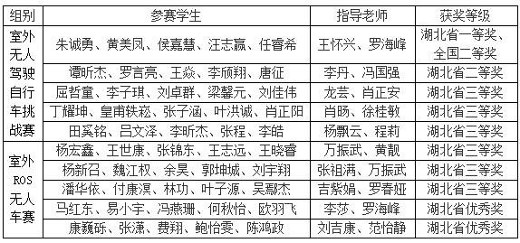 我校物理与机电工程学院由王怀兴、罗海峰、徐桂敏、万振武、李丹、程莉等老师组织指导的10支队伍、共50名学生,参加了本次全国大学生智能汽车室外专项赛中“室外无人驾驶自行车挑战赛”“室外ros无人车竞速赛”两个赛项的比赛,共获得全国二等奖1项、湖北省二等奖1项、湖北省三等奖6项的优异成绩。获奖情况如下: